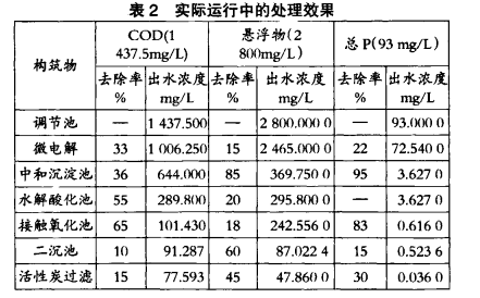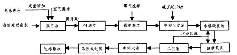 处理工艺采用微电解氧化、物化、生化、活性炭吸附相结合的方法。高浓度电泳超滤液与油漆前定量滴加处理废水混合后集中处理。废水首先进入调节池,通过调节池的空气搅拌均匀混合,然后通过提升泵提升到微电解塔。稀硫酸调节废水pH值约为3。pH值调整到位后,废水进入微电解塔。微电解塔中的废水通过空气搅拌与微电解填料充分反应接触。
